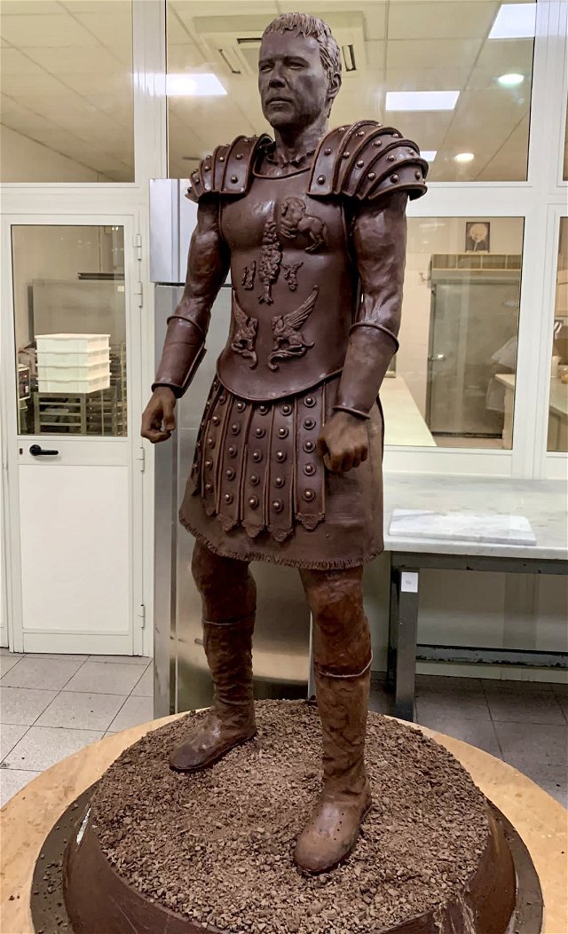Russell Crowe, the actor who portrayed the lead role in the 2000 action film Gladiator, shares on Twitter this photo of a chocolate sculpture shaped in the likeness of his fictional self. Artist Triziano Cassar will present it at the Hamrum Chocolate Festival in Malta on October 21.